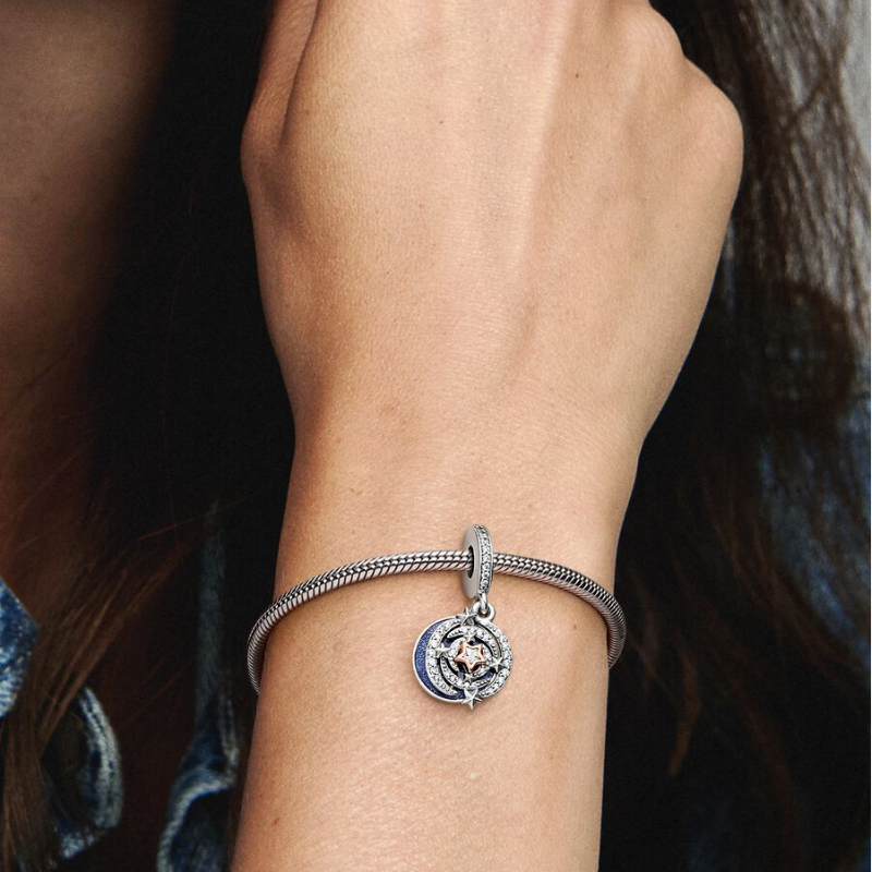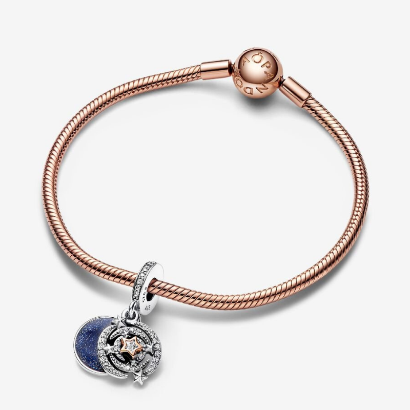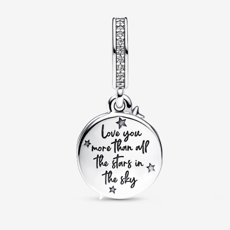 Wish upon a star with the Two-tone Shooting Star Double Dangle Charm. Crafted with both sterling silver and rose gold-plated metal, this one's sure to be a hit among lovers of two-tone charms. With a "Love you more than all the stars in the sky" engraving, this shooting star charm features shimmering blue enamel to represent a galaxy filled with twinkling stars. The dangle charm's second disc has an openwork pattern of shooting stars, where each star has a curved trail of sparkling stones and beaded details. A row of stones on the bail adds a sparkling touch. Add some special shine to your everyday, or inspire someone you love to always shoot for the stars.