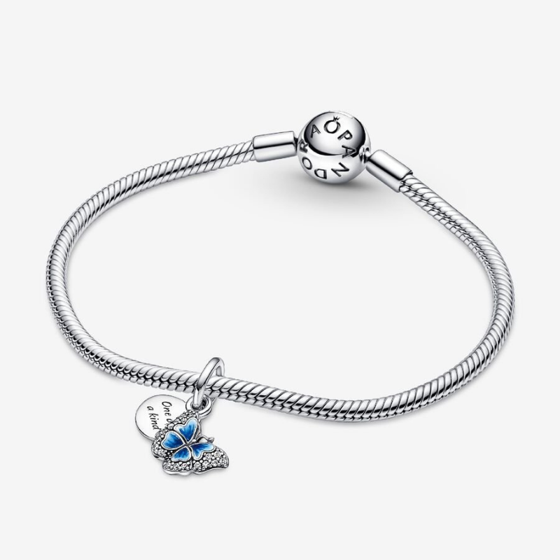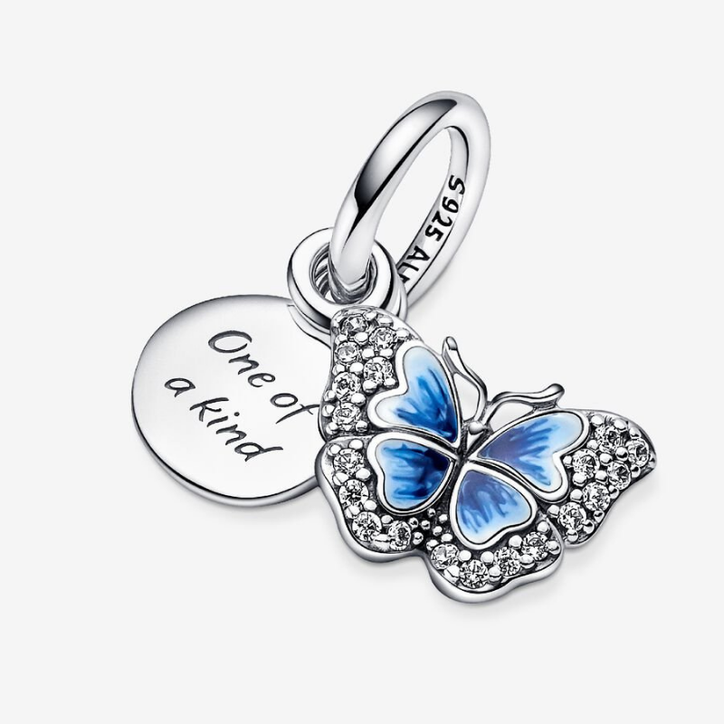 Take a moment to reconnect with nature this spring and enjoy the beauty of the season with our Blue Butterfly & Quote Double Dangle Charm. Featuring hand-painted wings and brilliant-cut clear cubic zirconia, this charm also has a sterling silver medallion engraved with the message "One of a kind." Just like butterflies in nature, each charm is completely unique. Wear it with our matching blue butterfly earrings for a coordinated statement this spring.