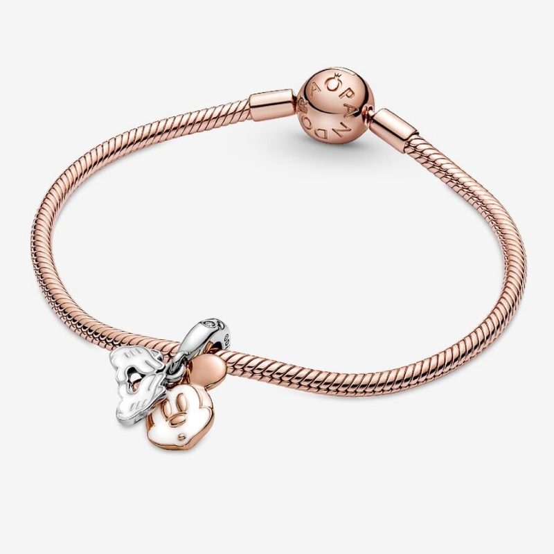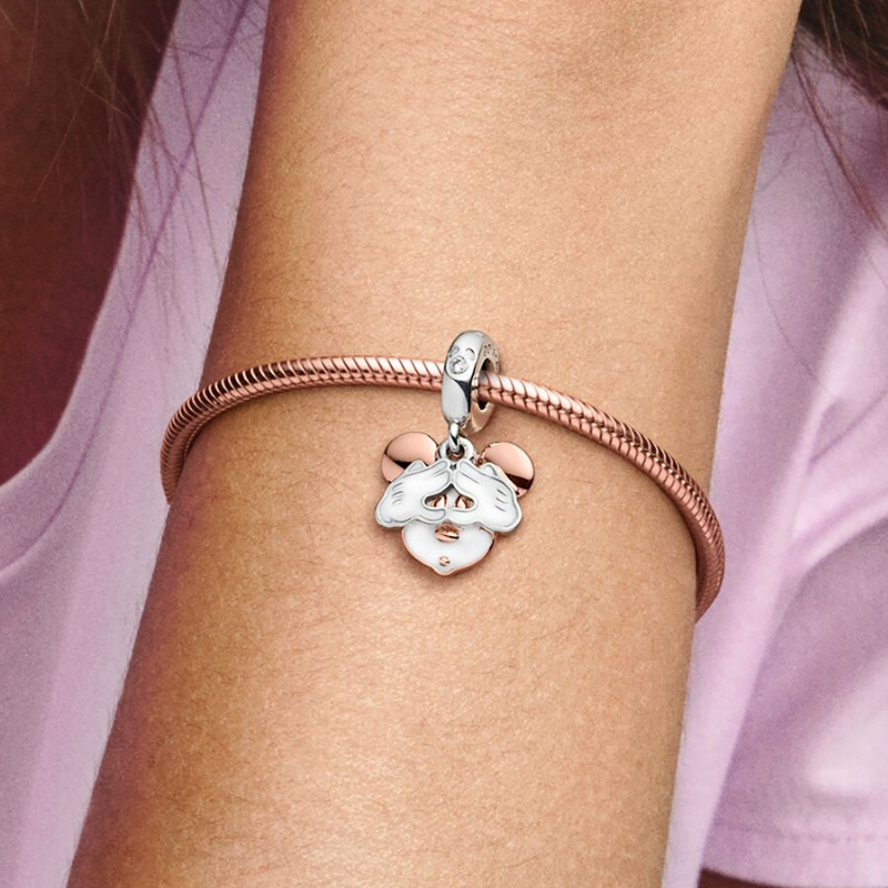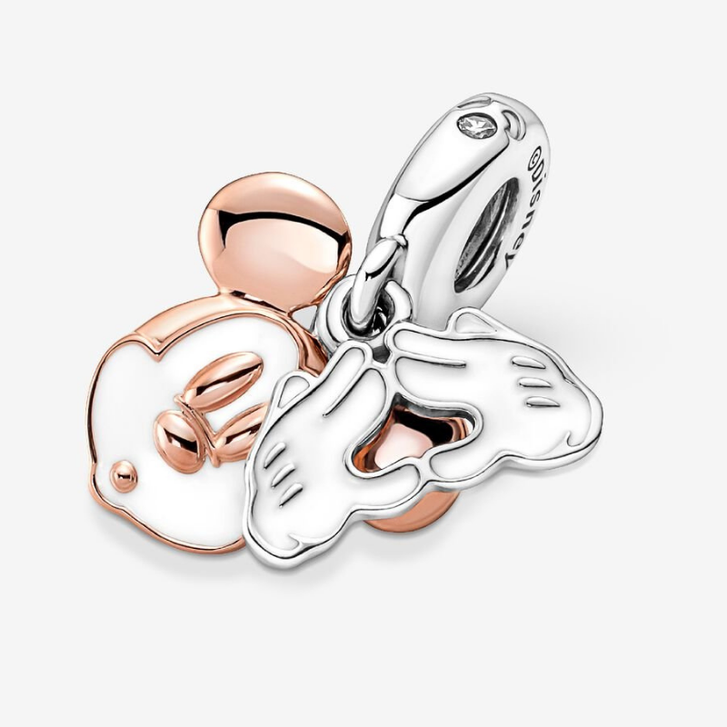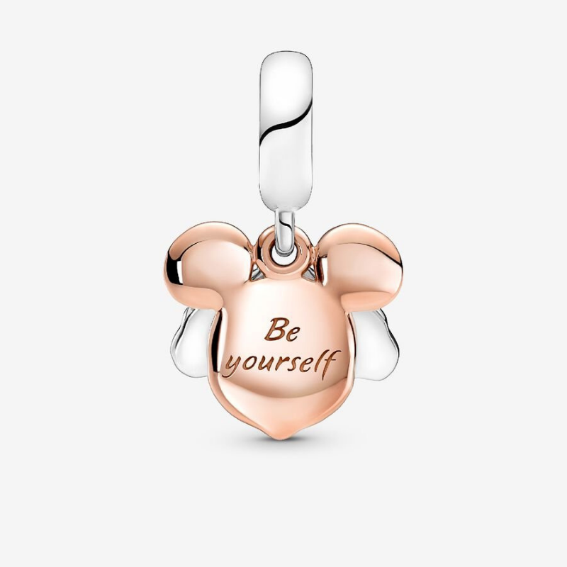 This Disney Mickey Mouse Double Dangle Charm is the perfect reminder to always be yourself and trust in who you are. Hand-finished in sterling silver and 14k rose gold plating, this charm features Disney's Mickey Mouse peeking through his hands, with two separate elements of the charm that allow him to lift his hands away from his eyes and come out from hiding. Decorated with white enamel details and an engraving on the back that reads "Be yourself", wear yours as a celebration of your individuality.