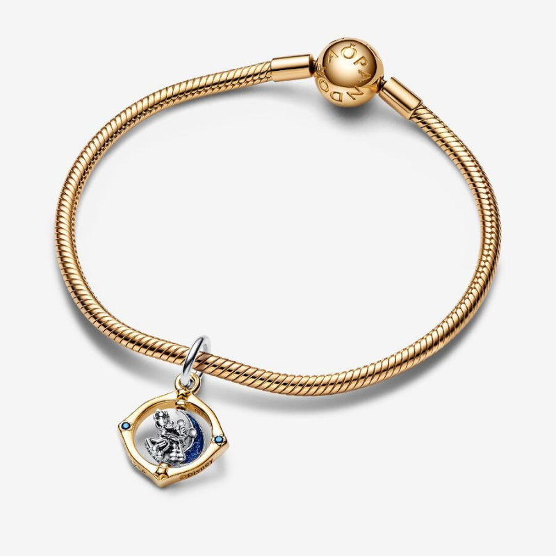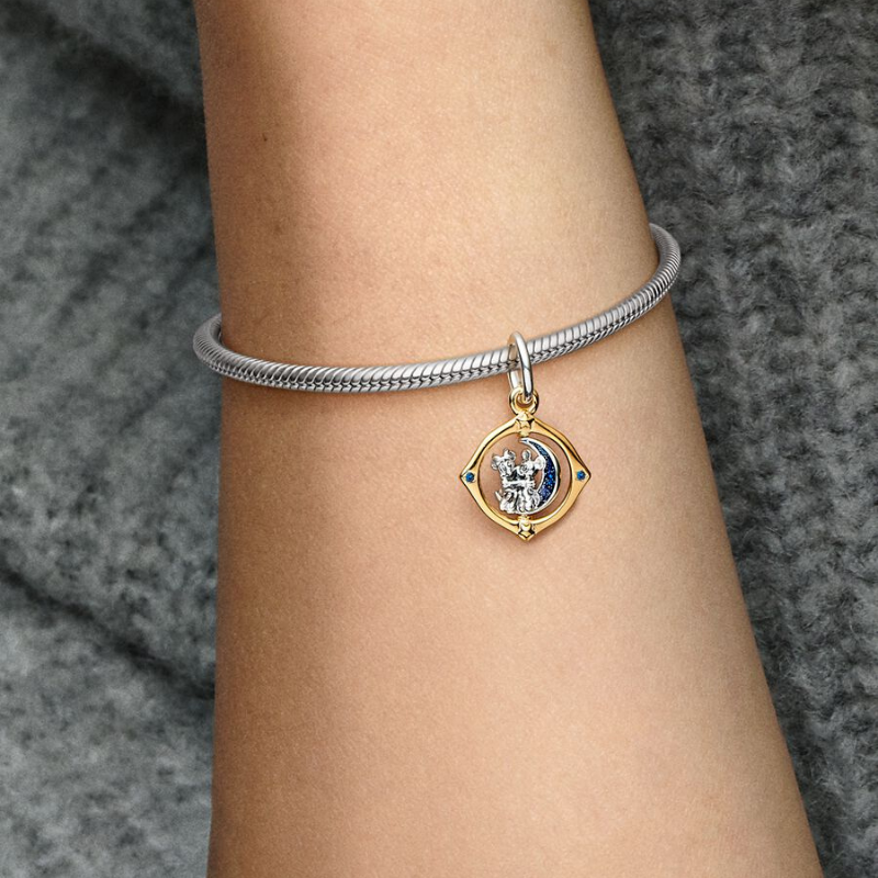 Capture the magic of Disney with the Disney Mickey Mouse & Minnie Mouse Two-tone Spinning Moon Dangle Charm. Mickey Mouse and Minnie Mouse take to the stars in their very own twinkling crescent moon, in this Disney x Pandora charm. The crescent sterling silver moon features Mickey Mouse and Minnie Mouse embracing in a hug, inside a border of 14k gold-plated metal. Making it even more special, everybody's favourite Disney duo can spin 360°. Wear this two-tone charm with your favourite mixed-metal look for a playful festive touch.