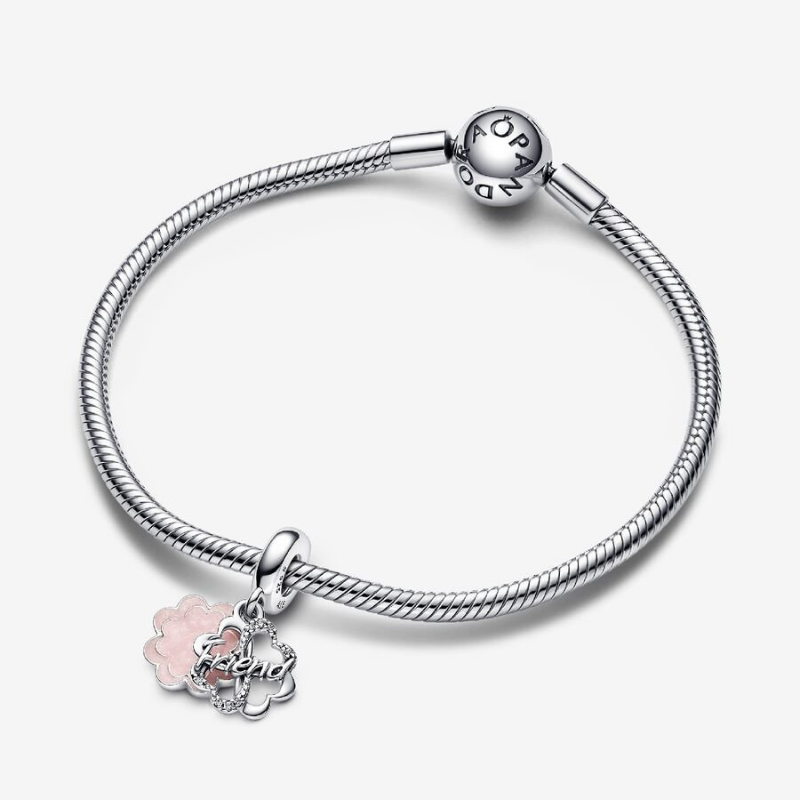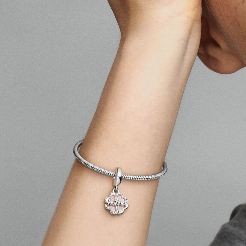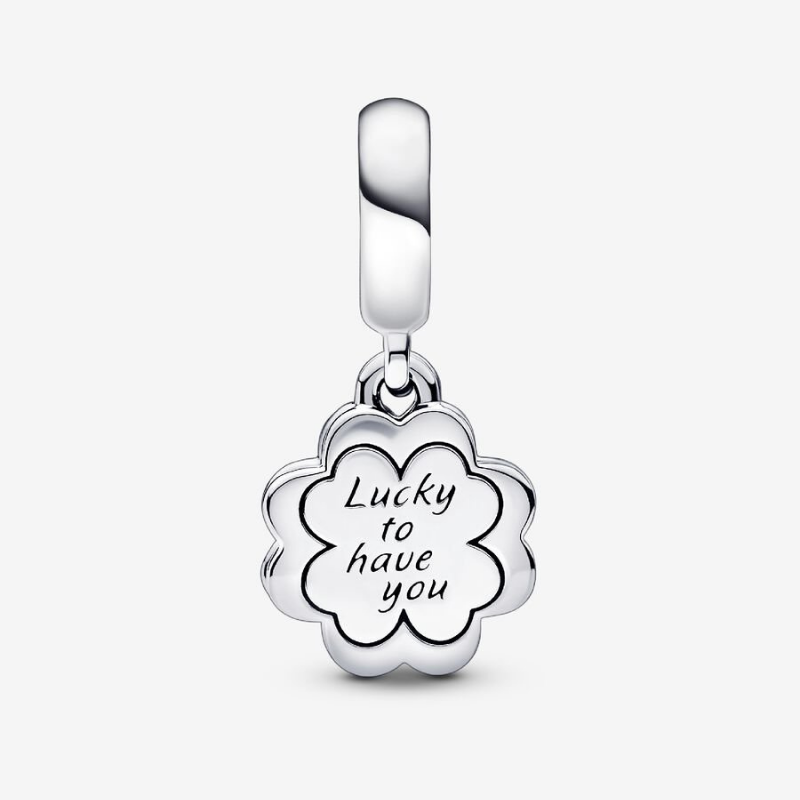 A twist on a well-known symbol of luck, our Four-leaf Clover Friendship Double Dangle Charm shines with a message of love and appreciation. Crafted from sterling silver, it features cut-out hearts coming together to form a four-leaf clover on one dangle. The other dangle, also clover-shaped, is covered in powder pink enamel on one side and an engraving on the other: "Lucky to have you.” The perfect addition to a friendship bracelet.