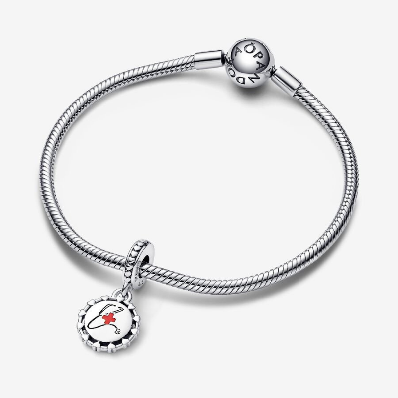 The Stethoscope Engravable Dangle Charm is a tribute to the meaningful and life-saving work of doctors, nurses and medical staff around the world. Crafted from sterling silver, this disc-shaped charm features a stethoscope and red cross motif on one side with enamel details. The other side is blank for your own engraving, and a pattern of hearts adds detail around the edges and bail. A meaningful gift for a loved one in the medical professions.